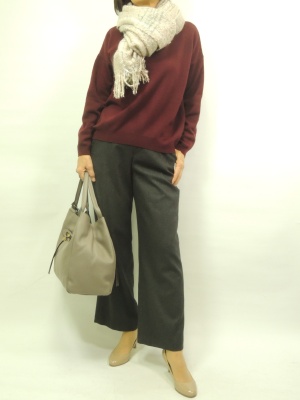 ワイドパンツはこの秋一つは取り入れたい。グレー×ボルドーで大人のお洒落!スタイリッシュ度70%、エレガンス度30%。