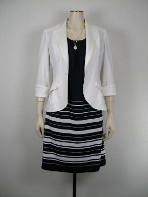 白のジャケットにネイビーのワンピースでマリン気分。差し色のバッグは赤もいいけどグリーンも爽やかです。スタイリッシュ度70%、フェミニン度30%。