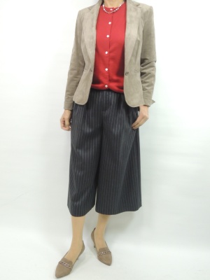 赤のカーデをあえてインナーとしてパンツで合わせる。ジャケットを組み合わせればきちんとした印象に!エレガンス度60%、スタイリッシュ度40%。