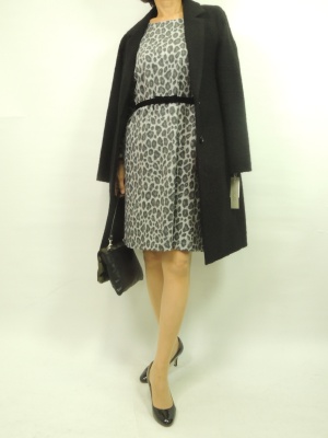 アニマル柄のワンピース一枚でサマになる。黒のコートを合わせればこれからの時期のお出かけにピッタリ!エレガンス度90%、スタイリッシュ度10%。
