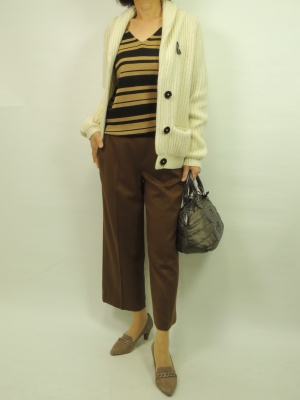 ワイドパンツ派流行の九分丈をチョイス。ニットジャケットで合わせると固くならない!スタイリッシュ度80%、エレガンス度20%。