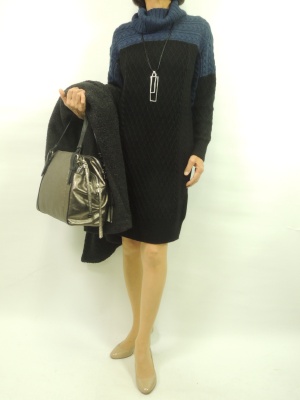 ニットワンピースも体のラインを強調しない、サックワンピタイプはとても着心地が良い。お出かけにも重宝!エレガンス度70%、スタイリッシュ度30%。