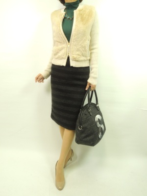 タイトなスカートにブルゾンでスレンダーなシルエットに。インナーにグリーンを入れて秋モードに!スタイリッシュ度80%、フェミニン度20%。