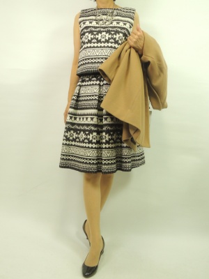 ワンピースのようなセットアップは白×黒のコントラストが絶妙。キャメルの色を添えるとエレガントさも数段アップ!エレガンス度90%、フェミニン度10%。