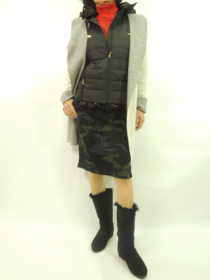 薄手のダウンベストはコートインに使って重ね着ファッションを楽しむ。インナーの赤色が全体を締めてメリハリがつくコーデ!アクティブ度80%、スタイリッシュ度20%。