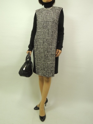 サックワンピースはそのままでも良いが、インにタートルを合わせるとちょっとフェミニンな装いになって着やすくなる!エレガンス度70%、フェミニン度30%。