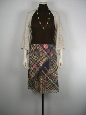 落ち着いた形のワンピースですが、スカートのドット柄が少し個性的。アクセサリーで、ドット柄を繰り返してみました!エレガンス度70%、フェミニン度30%。