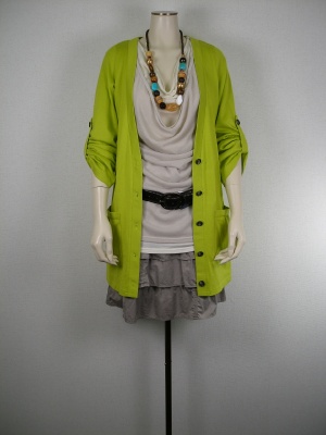 春なのでこんなビタミンカラーの羽織物が一枚あるとコーディネートにメリハリがつきます。ドレープとフリルで女らしく!スタイリッシュ度60%、フェミニン度40%。