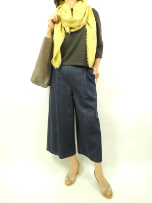 夏のお出かけに欠かせないデニムファッション。 ガウチョパンツは涼しげで楽ちんです。 トップスは秋色をチョイスして!