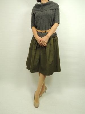 グレーのオフタートルは5分袖なのでしっかり二の腕を カバーしてくれて濃いめのグレーがクールな印象を与えてくれます。 カーキのギャザースカートでボトムスにふんわりボリュームを出すことで 大人の可愛さを引出し、トップスとのバランスもよくなります。 スカートは色違いでベージュと黒があります。 どの色もあわせやすいですね。 肩を出すことに抵抗がある方はそのまま来ていただいても大丈夫です。 (2WAYとしてご利用いただけます)