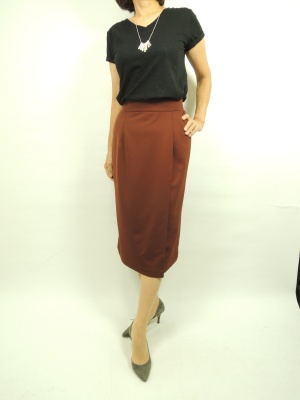 今季注目のブリックカラー。(煉瓦のような赤身かかったブラウン) 紺、黒、ベージュととても相性がよく、今回は黒のカットソーで 合わせてみました。スカートはラップ風の巻きスカートで、タイトですが動きやすいです。 足元の合わせる靴はブリックカラーとグラデーションになるようなものを 持ってくると馴染んで足元が綺麗に見えます。 シンプルこそ色味で差をつけてオリジナルのコーディネートを楽しみましょう!
