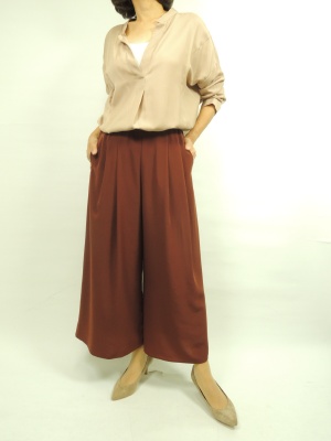 タックの入ったスカーチョはあまり広がらずに すっきりとしたデザインが特徴。 ビッグシルエットのシャツとのバランスが取れて良い。 色も流行の色を組み合わせてシックなイメージに!
