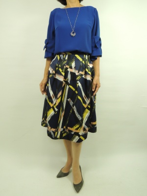 フレア袖にリボンデザインでポイントを付けた袖に 同系色のスカートはとてもよくマッチします。 ネイビーのグラデーションで晩夏の装いを!