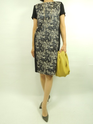 中央に柄のあるデザインワンピース。 タイトなシルエットが体のラインをひろわず、すっきり見せてくれる。 ロングカーデを合わせれば秋の装いになりますね!