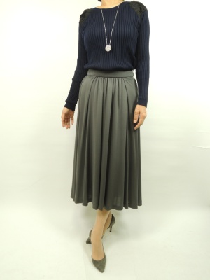 アッシュローブの前後差のあるスカートは、秋バージョンで進化して再登場です。 素材はテンセルでトロミのある質感で落ち感あるのですっきり見えます。 トップスにリブニットでタイトなものを合わせてより細身に。 肩の部分にレース状のデザインがとても女性らしく見えます。 レース部分は黒色ですが透け感があるのでネイビーとの相性もバッチリです!