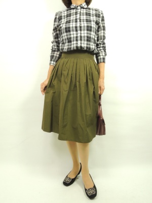 チェック柄のシャツはいつもデニムに合わせてカジュアルテーストになりがち。 そんな時少し着こなし方が違うだけで甘口のフェミニンコーデに変わります。 ボタンを全部止めて(首まわり)ネックレスなどのアクセサリーを付け、 ボリュームのあるスカートにインして着ます。 パンプスや小物でアクセントをつけて、いつもと違う雰囲気にコーディネート!