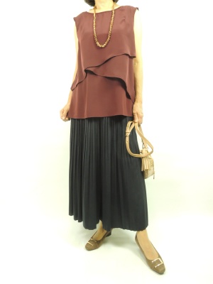 女らしさやきちんと感のあるエレガントコーデ。 プリーツのスカーチョは裾部分になるにつれて、 プリーツのひだが緩く広がっています。 こうしたデザインでよりスカートっぽく見え、 エアリー感が増します。 ネイビーとボルドーの組み合わせは重たくなりすぎず 大人のかわいらしさも引き出してくれます!