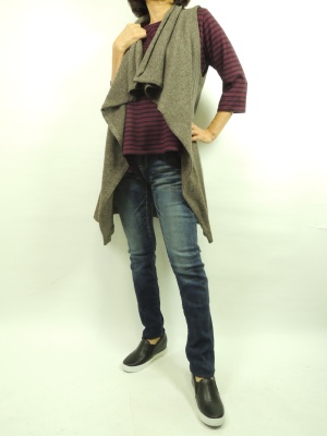 ジレといえば少しがっちりしたイメージものが多いですが、 今回着用したハルズアミのジレはお素材使いで ややふんわりしたシルエットです。 新ブランドのデニムと合わせました。 こちらのデニムはボーイズタイプですが、そこまで ワイドではないので綺麗に見せてくれます。 ボルドーとダークブラウンが秋らし良いコントラストで・・。