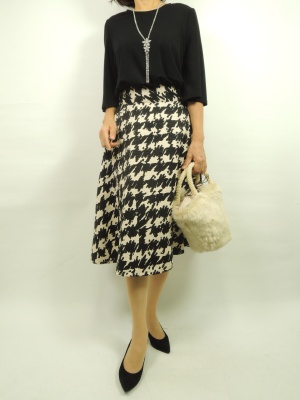 丈の長さも膝下でやや長めのデザインなので、 同系色の黒のブラウスで引き締めてみました。 ブラウスをインして着て頂いても良いですし 出してワンピースっぽく着て頂いても大丈夫です!
