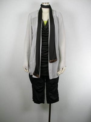 タラリとしたカットソーとカーディを三点まとめてトップスに持ってきました。チラッとスパンコールの輝きがストールに・・。パンツはサルエルのエレガントなデザインでまとめてみました!スタイリッシュ度80%、アクティブ度20%。