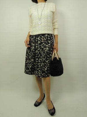 全体を白と黒でまとめてみました。スカートは白黒の柄になっていて ギャザースカートで程よいふんわり感が女性らしくとてもかわいいです。 トップスのニットは千鳥格子になっていて薄手のニットなので 早い時期から着こなせます。黒のフェイクファーのバッグが 黒ですがかわいらしさがより引き出してくれます!