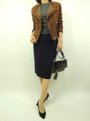 ハードに見えるライダースですがスエードのブラウン系でしたら 女らしく着こなしに取り入れることができます。 今回のニットのタイトスカートでオシャレに決めてみました。 袖をたくし上げて着崩すと良いですね!