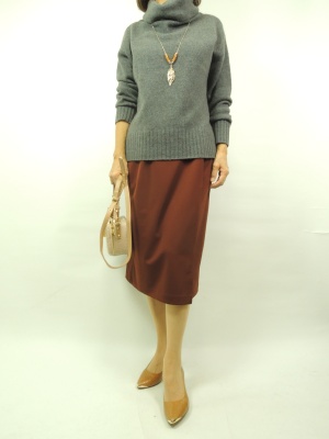 ブラーミンからヤク100%の新作ニットでコーディネートしてみました。 今回はミディアムグレーのお色を使いましたがモカのお色もございます。 グレー×ライトブラウンで今年の色を取り入つつ、ラップ風のタイトスカートで カッコよさを表現。スカートはそこまでピッタリしたタイトスカートではないので ヒップラインが気にならずとてもはきやすいです。 ラップ風になっているので歩きやすいし、今後のニットやブルゾンなどと 合わせやすいので一枚あると安心できるボトムスです!