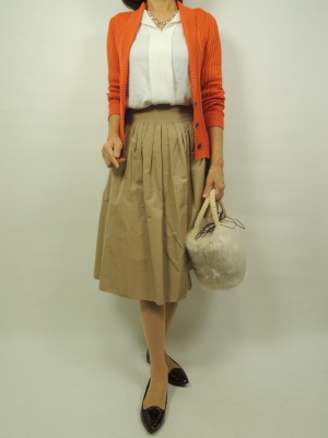 明るめのオレンジの新作カーディガンでコーディネート。 ベージュのスカートに合わせて正統派ですが少し挑戦した色を入れて・・。 リブ編みのカーデが縦のラインを出してすっきりと見えます。 スカートはボリュームが出る分トップスはすっきりまとめて!