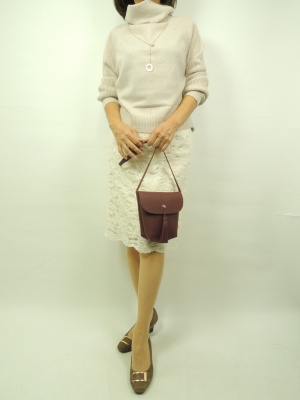 今期レースのお洋服がとても多く出ていますね。 レースはとても女性らしく、上品なイメージを持っていますので 一着あるといろんな場所で使えるのでお勧めです。 今回は白のレースのタイトスカートに淡いピンクベージュのニットを合わせました。 スカートはレースのブラウスとセットアップになりますが あえて別のニットで合わせました。 淡いグラデーションの色合いがとても素敵ですよね。 ニットはそこまでボリュームの出過ぎないもので合わせました。
