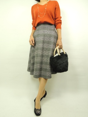 ヌークの格子柄が大人の可愛さを表現してくれるフレアースカート。 こちらは膝下あたりのやや丈長で、とても上品なデザインです。 少し落ちつき感のあるお色なのでトップスは少しインパクトのある オレンジ色のニットを合わせました。 少し太めのリブ網が可愛く、顔写りも良いです。 V字開きで首回りもすっきりします!