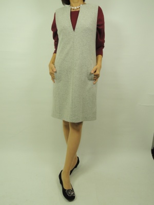 色が明るめのグレーでとても清潔感のあるフィグノワンピース。 胸元がV字に開いていて、形もすっきりしたデザインですので シンプルにボルドーのニットと合わせました。 さし色でボルドーを合わせて、メリハリのある雰囲気に。 もう少し寒くなったらタートルやシャツなんかを合わせても良いですね。 プリフィエのニットは形違い、色違いがあります。 こちらのニットは今から着れるので大変人気です!