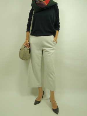 ヌークの新作パンツはニット地ですがすっきりとしたデザインで 裏地もついていますので冬でも暖かくサラッとはけます。 アイスグレーの色がとても綺麗で トップスのグリーンととても相性がよく リバーシブルのマフラーもグリーンと合わせました!