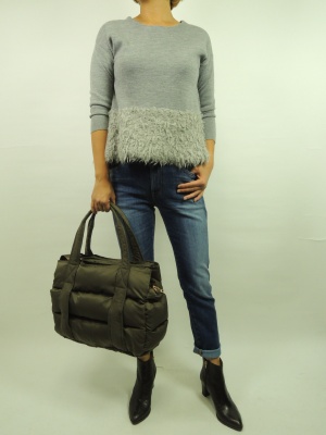 ベアトリスのスリムなデニムはトップスで遊びたい。 切り替えの下の部分が同色の異素材を使ったキュートなデザイン。 デニムの裾は三つ折りにして足首を少し出してブーツを合わせてみました。