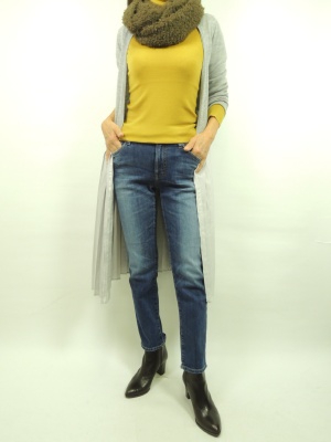 ソーノのカシュクールで前を詰めてワンピース風にも着られる一枚。 今回はベアトリスのデニムにさらっと羽織ってカーデとして着用。 柔らかなプリーツが女らしくデニムスタイルをオシャレに見せる!