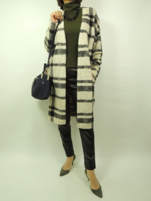 大きなチェック柄のコーディガン。 シンプルな上下の組み合わせに一枚羽織るだけで ちょっとおしゃれ度がアップする。 ドロストのレザーパンツをヒールで合わせて大人のエレガンス デザインの完成!
