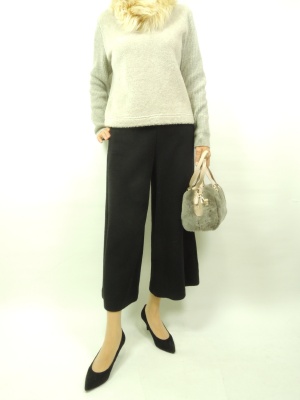 流行のニットワイドパンツはニット風の生地のカットソータイプなので シルエットはもろ体のラインを拾わないので綺麗に着れます。 パシオーネのふんわりニットにパシオーネのスヌードでポイントをつけて!
