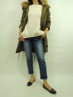 細身のインディマークデニム。 それもアンクル丈は足首を強調して、足長に見せてくれる。 合わせたトラッゾドンナのニットはボリュームのあるケーブル網みのニット。 カジュアル感を出すために重ねたミランカのコートはもっずコートをチョイスする!