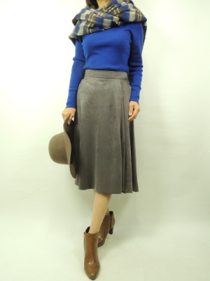 プライオリティのリブ網ハイネックニットは薄手で一枚持っていると重宝します。 アッシュローブのスカートにインしてもかさばらず、しっくりまとまります。 インパクトのある色をマフラーの色にリンクしてコーディネートしました!