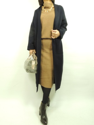 マリードールのニットワンピースは一見セットアップに見えますが つながったワンピースになっています。 ウエスト部分にゴムが入っているので ウエストできちんと止まって ブラウジングしたようになります。 丈はやや長めのスカート部分は人気のスリットの入ったデザインで 動きやすいです。ヌークの上質着流しコートを合わせました!