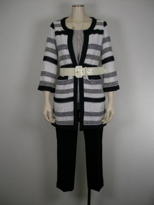 スッキリとしたパンツにマリンテーストのロングカーディ。上から太ベルトでギュッと占めるとウエスト位置が上がって足長に見えます!スタイリッシュ度100%。
