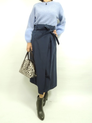 袖口に同系色のシャギーがワンポイントになったニット。 こちらは色違いでホワイトもあります。 ブルーのお色がパステル系の優しいお色なので ネイビーのスカートととてもよく合います。 お袖にボリュームが少し出るのでスカートの中に インしていただくとすっきり見えます!