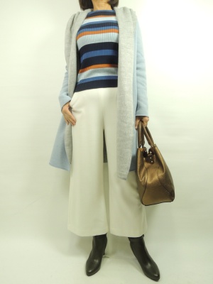 ププラのダブルフェースのコートはこの冬から春にかけて 注目されているブルーのお色。パステルの様に優しいお色と 中のグレーがオシャレ感をより一層増します。 ダブルフェースののコートは合わせるものによってエレガンスにも カジュアルにも使えます。中に合わせたニットも同系色のブルーで合わせました。 冬の明るめのカラーで合わせて重くならないようにコーディネートしました!