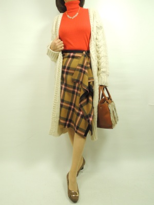 巻きスカート。前は黒でコーデしましたが、 今回はオレンジの鮮やかな色をキーポイントにコーデしました。 スカートの中のオレンジ色にニットをリンク。 アウターは白で全体に明るい冬コーデにしてみました!