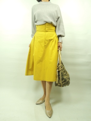 細編みの可愛めニットのご紹介。 こちらはライトグレーとグリーンの二色がございます。 クルーネックですので、首元はやや詰まったデザインとなっております。 イエローのスカートで合わせてみました。 ハイウエストのデザインなのでニットをインして頂いた方が バランスが取れてキレイに着こなせます!