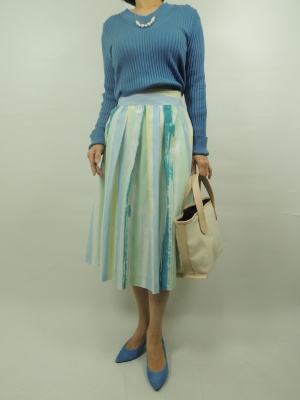 ブルーとイエローの色使いが春を感じさせてくれる。 同色のブルーをトップに合わせて。 Vネックは大人っぽく見せてくれるので ギャザースカートの分量にも負けない 上品な組み合わせです。 ブルー系の靴で足元をまとめてみました!