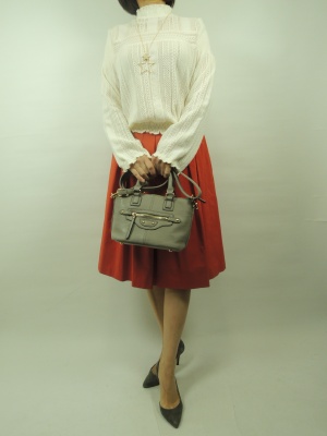 透かし編みのニットは見た目も軽く春らしい一着。 ボリューム袖も今年ならではですね。 鮮やかなオレンジ色のスカートで 春らしい合わせをご提案します!