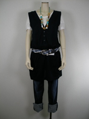 ベスト風のチュニックはやはりデニムで合わせたい。ポイントはメッシュのベルト。カジュアルな中にお洒落な色のベルトが映えますね!アクティブ度80%、フェミニン度20%。