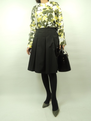 色が豊富に出てきている春の中で とりあえず黒を合わせることで きちんと感が生まれる。 トップスは大胆な花柄で顔回りが パッと明るくなって春らしいコーディネート!