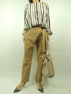 今年はウエストをマークしたり リボンのベルトなどが流行っています。 テーパード型なんてすが、フロントが重なるシルエット。 サッシュリボンは片方に寄った変形デザインです。 トップスは色を合わせてストライプのゆるシルエットブラウスを 組み合わせてみました!