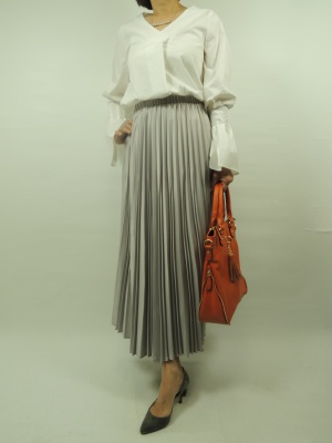 プリーツスカートは女っぽさが十分発揮できる一枚。 足元を気にせず動きやすいのも 一つの要素ですね。 シルバーグレーの光沢感が春の日差しに映えて 動くたびにキラキラして心も軽やかに。 白のブラウスはトレンドのボリューム袖スタイルで!